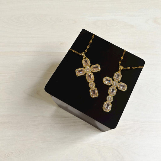 Iced Gold Cross Necklace - Clear