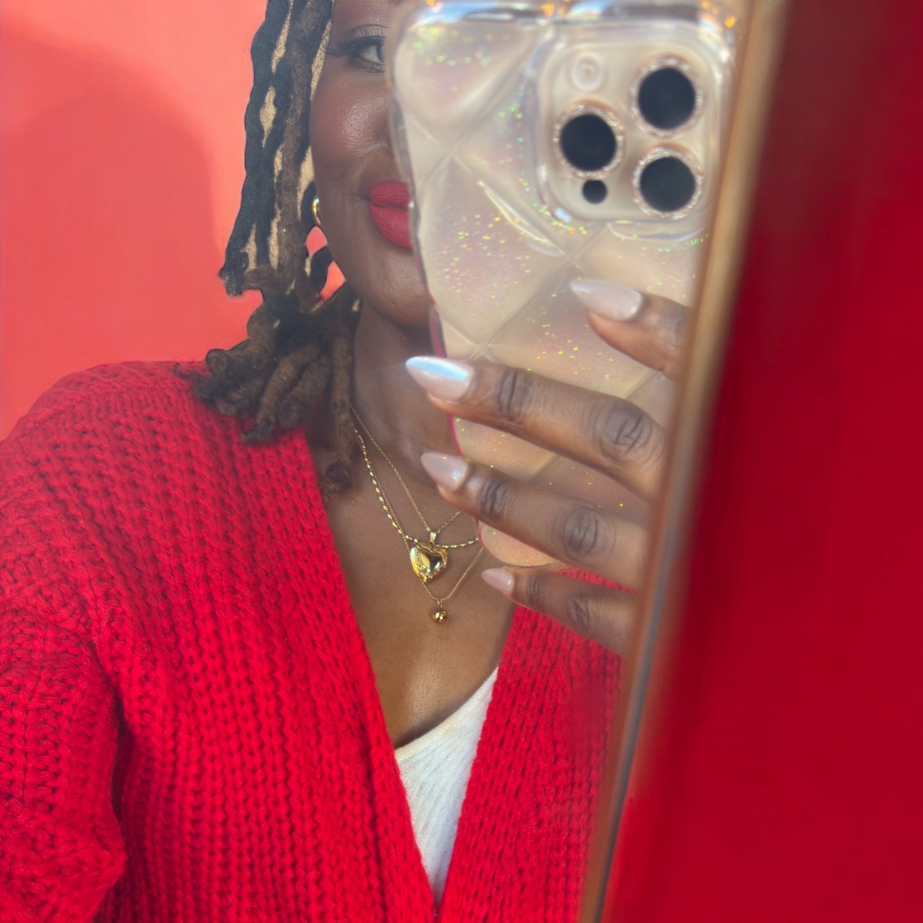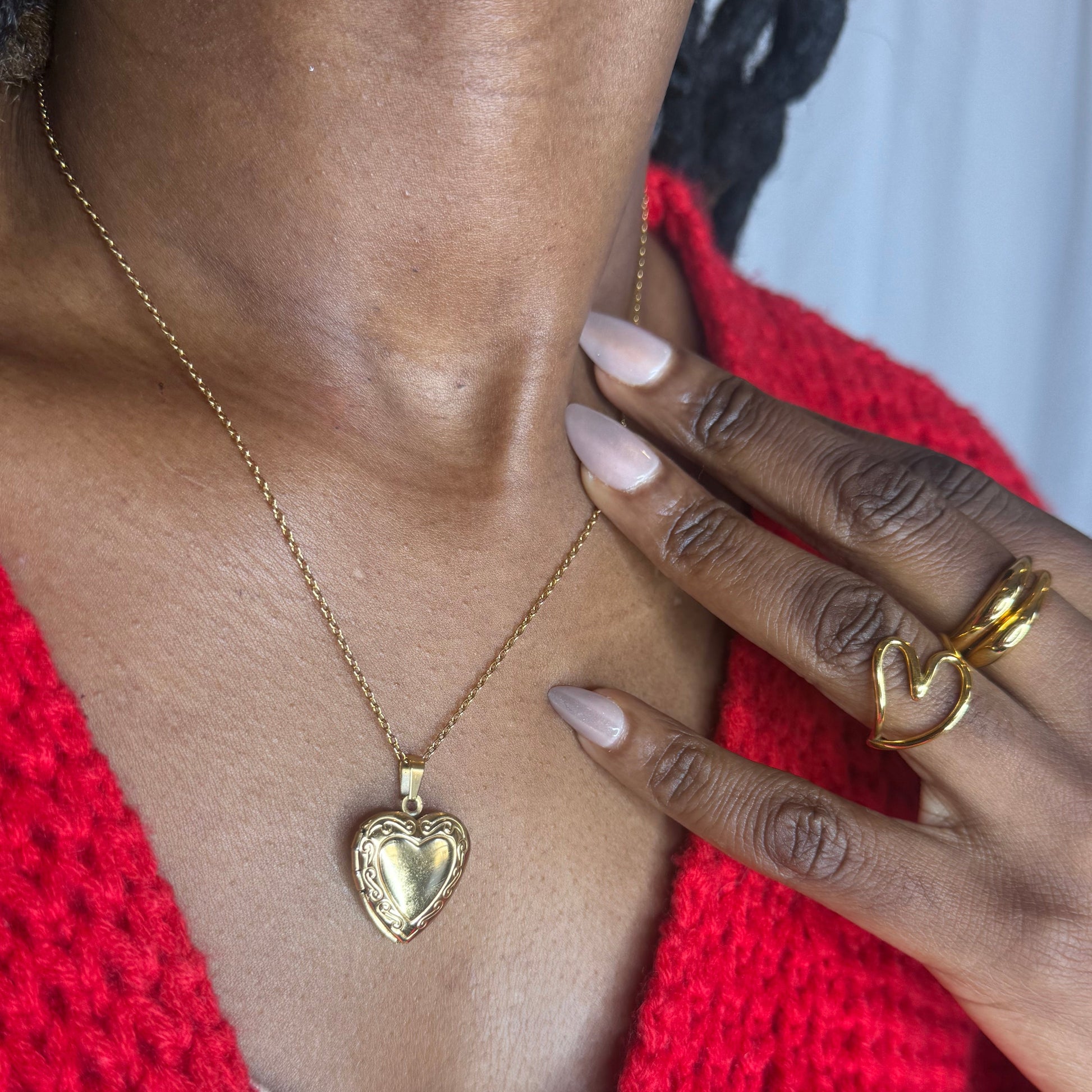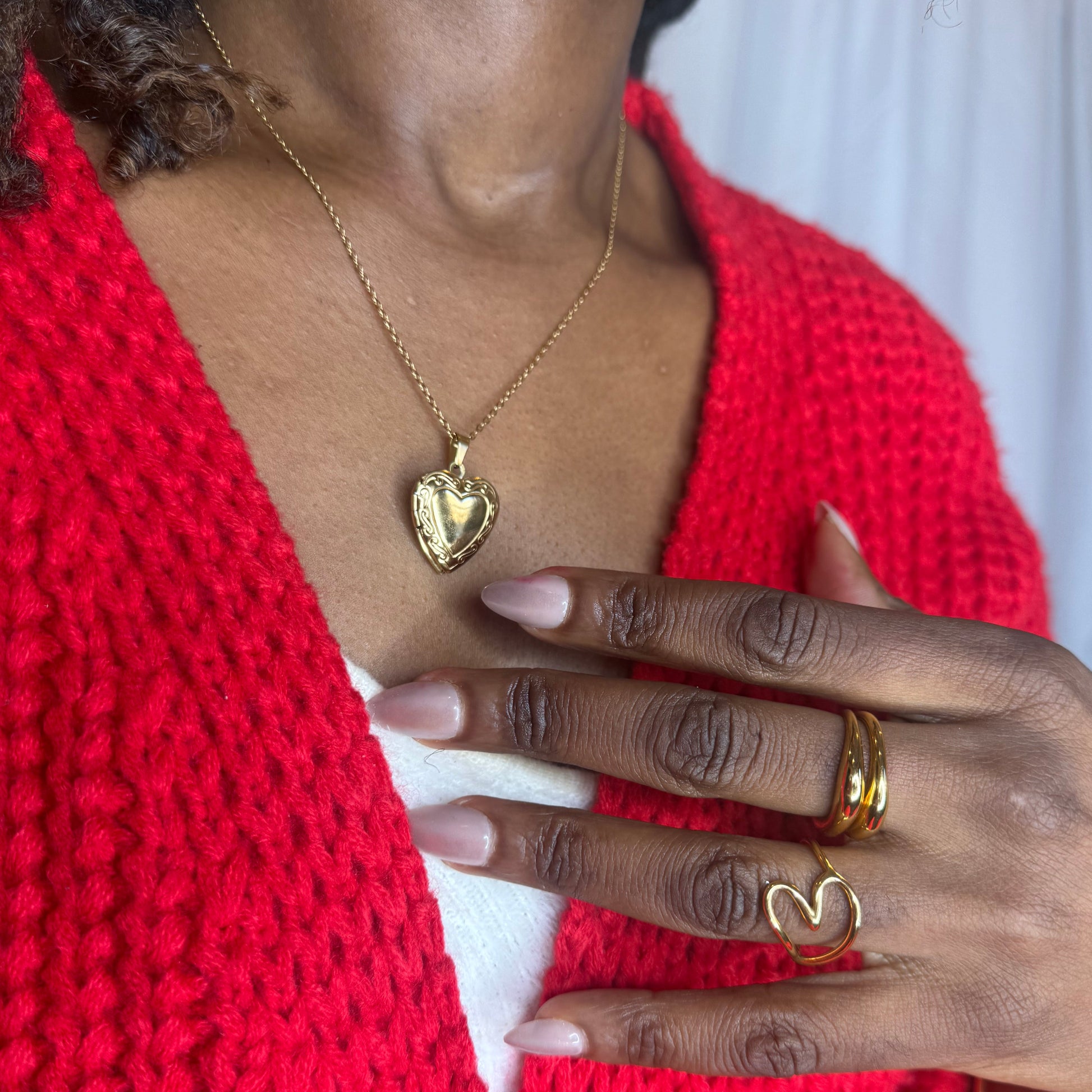 Styles with the Beaded Ball Pendant Necklace, the Hollow Heart Ring, and the Abstract Ring Set. Styles sold individually.