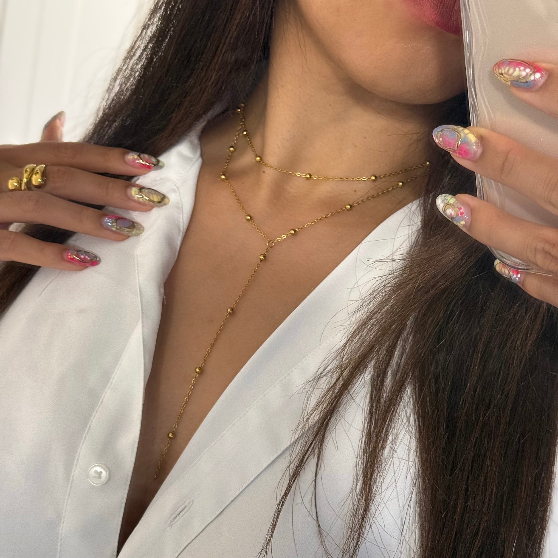 The Beaded Layered Y Drop Necklace features two delicate chains, accented with tiny gold beads and a graceful Y-drop detail that elongates the neckline. Feminine and flirty, it’s the perfect piece to add a little shimmer to your everyday wardrobe, or to dress up your favorite date-night look.