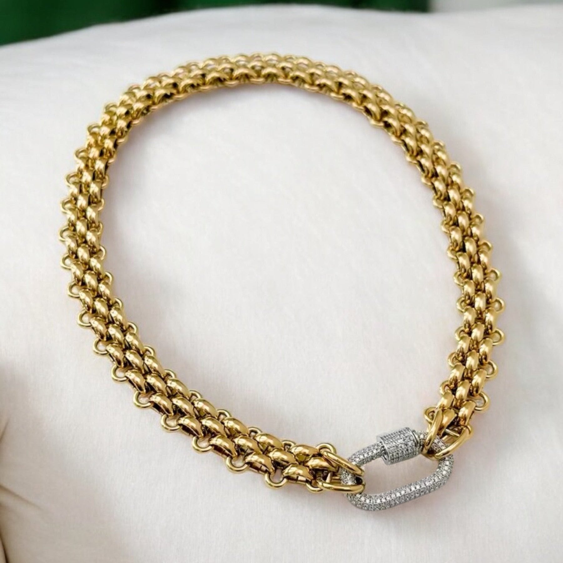 This gorgeous choker features a braided chain style with a carabiner clasp. The clasp is a twist closure, and is encrusted with crystals making this piece perfect for the person who loves a subtle sparkle. The Braided Chain Choker Necklace is gorgeous alone, or perfect for layering with a dainty style. The only question is, are you getting the gold clasp, or the silver for a mixed metal look?