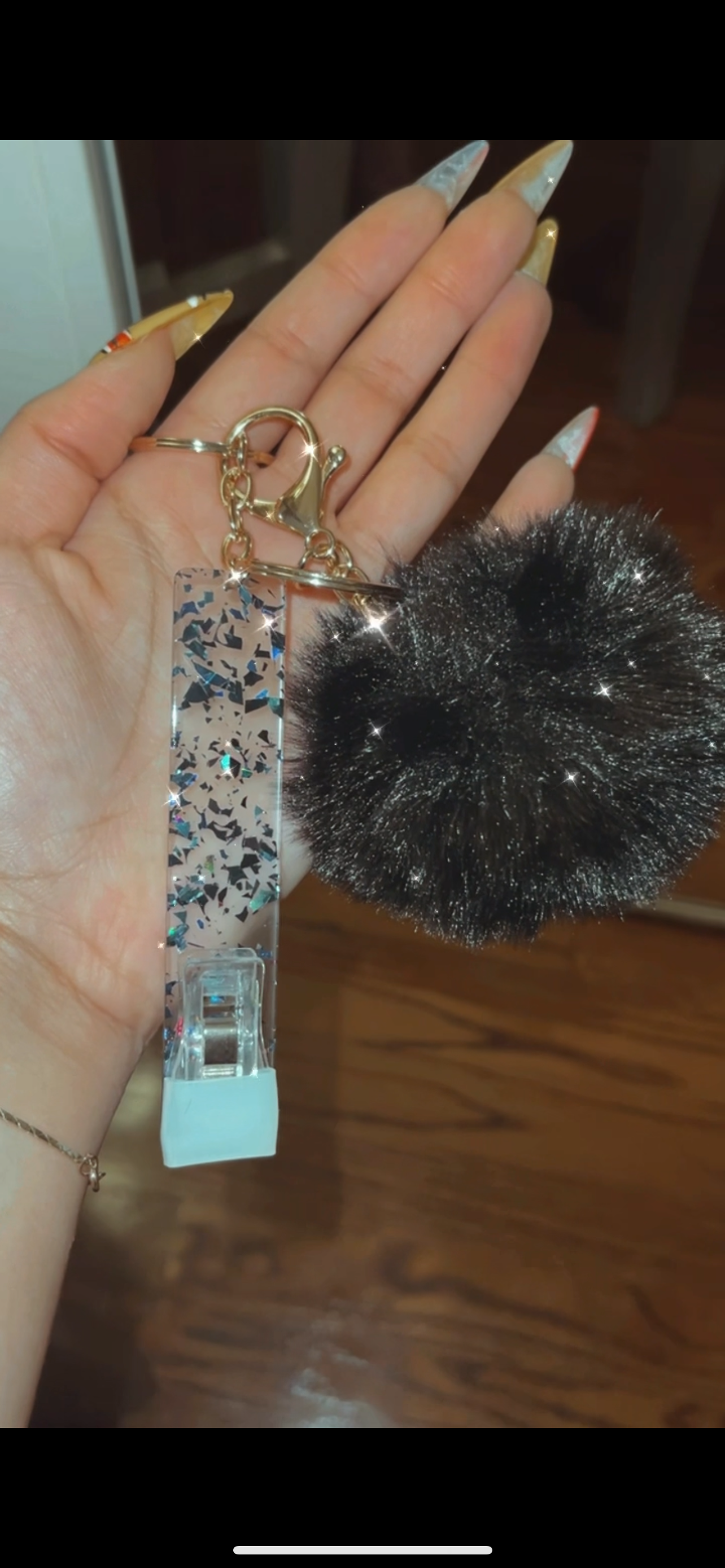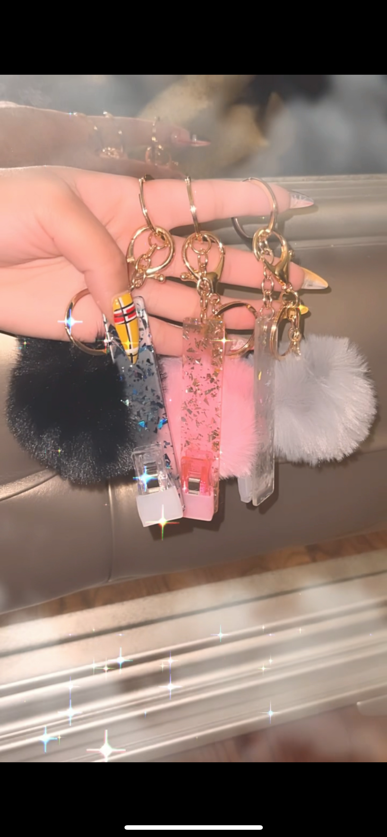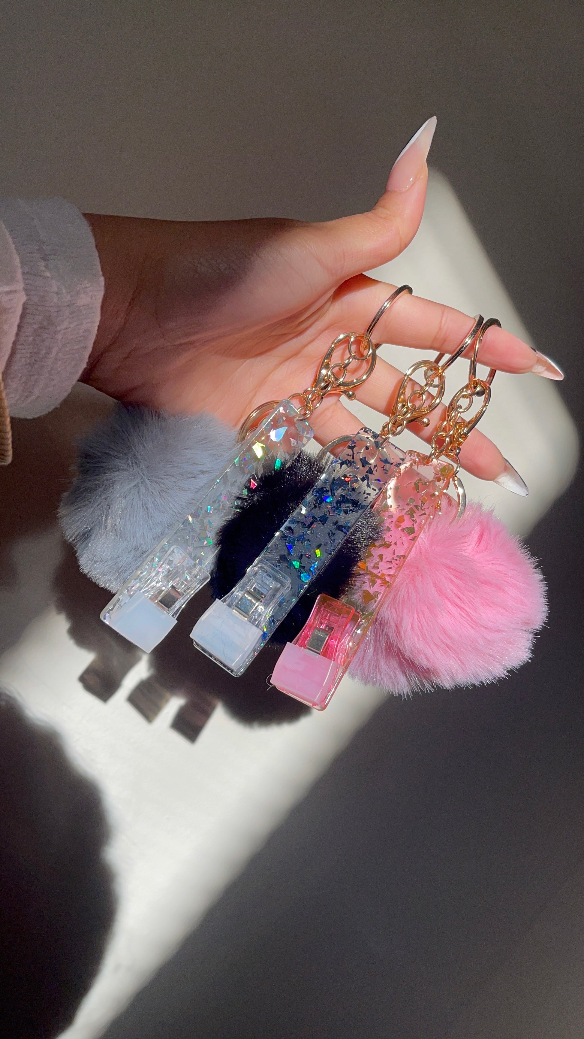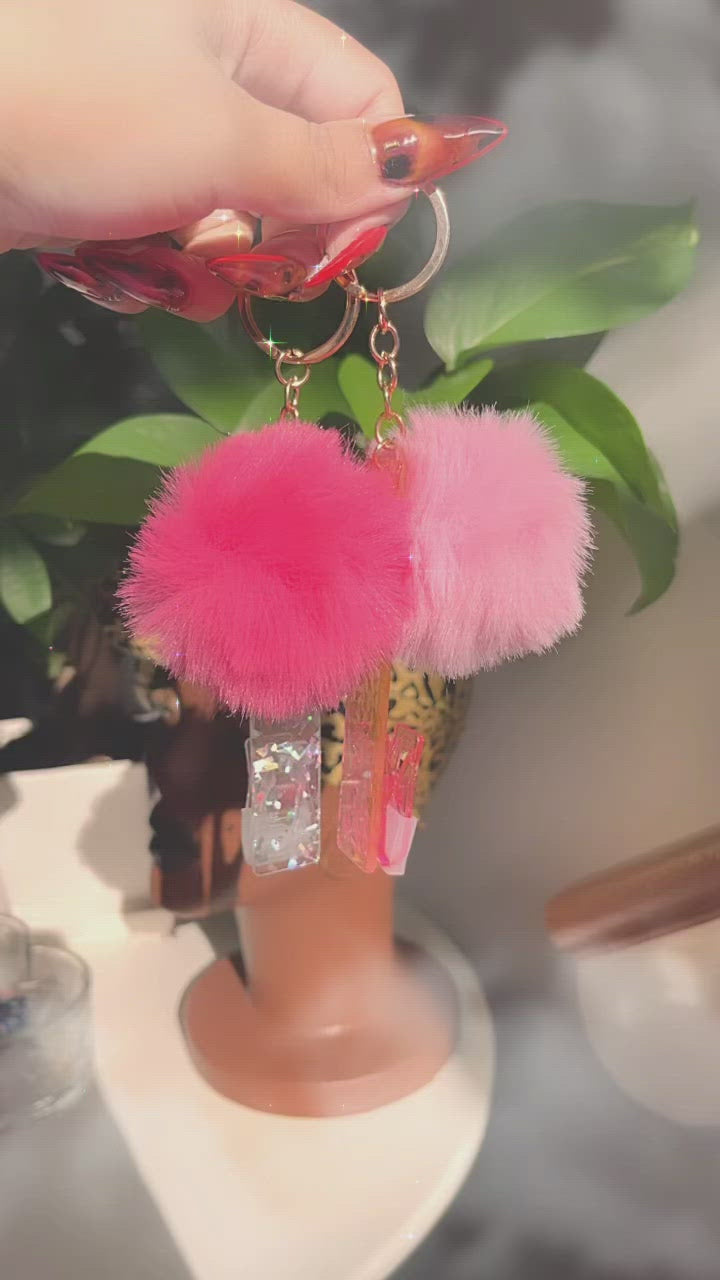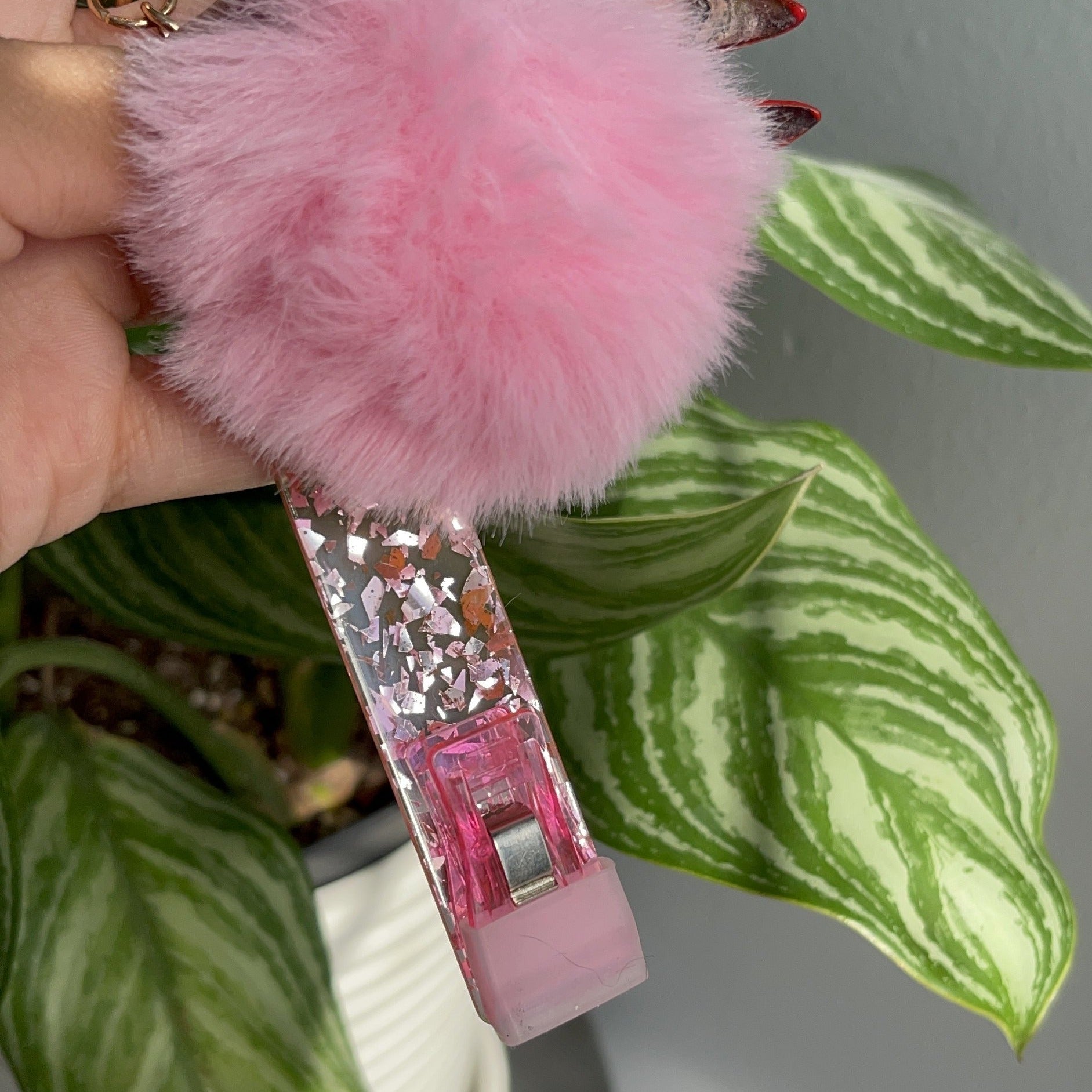 Keychain card grabber available in pink with a light pink pom pom or clear with a hot pink pom pom.