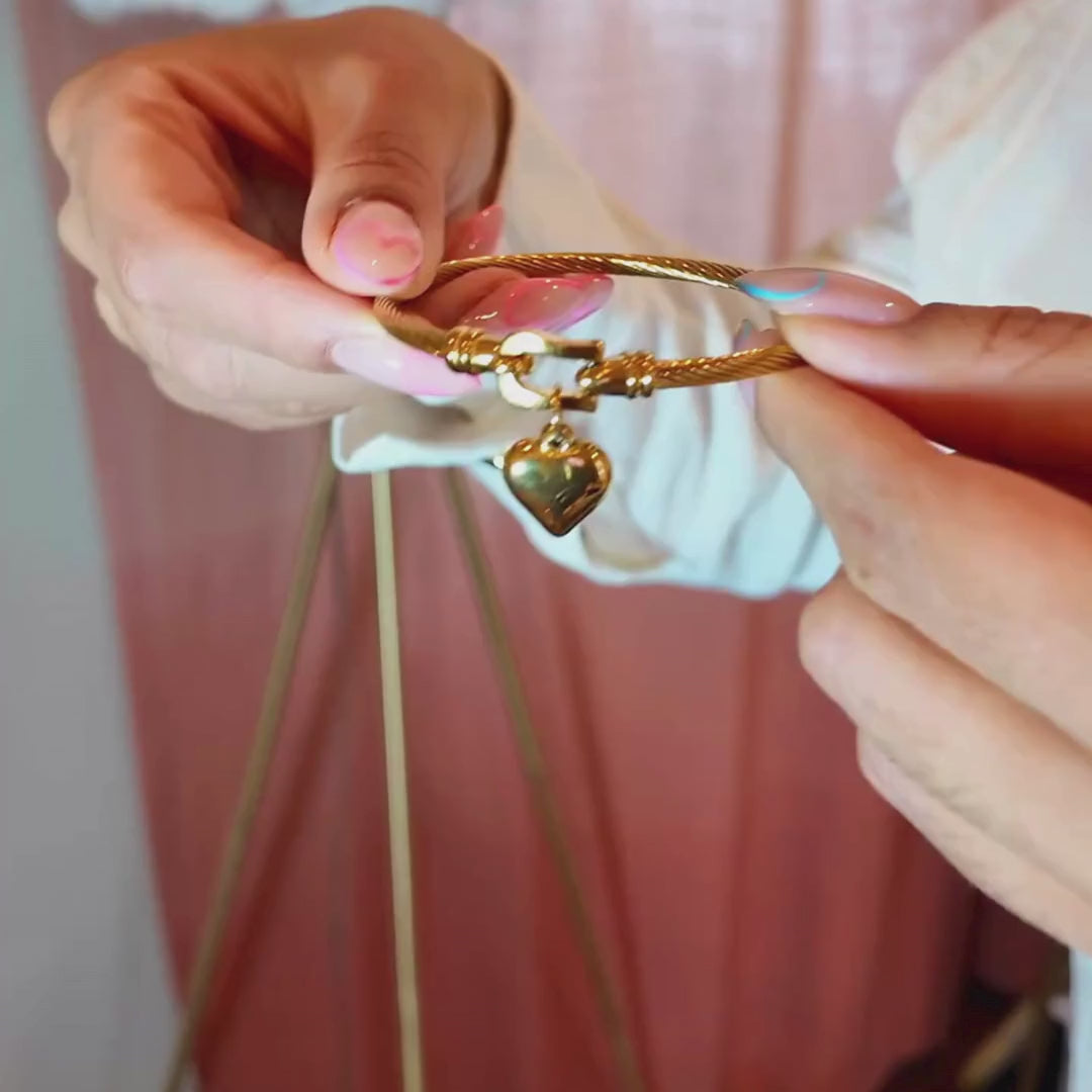 The Heart Charm Buckle Bangle pairs a sleek cable-style bangle with a polished buckle clasp and a dangling heart charm that catches the light with every move. It feels elevated, feminine, and effortless all at once. A classic, and feminine piece you reach for daily but still feels special every time you put it on.