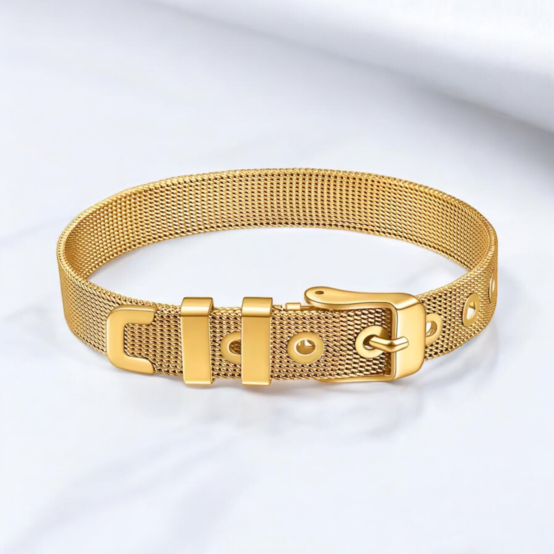 The Mesh Buckle Bracelet brings a modern edge to everyday styling. Designed with a flexible mesh band and finished with a bold buckle closure, it adds just the right amount of structure to your wrist without feeling heavy or stiff.