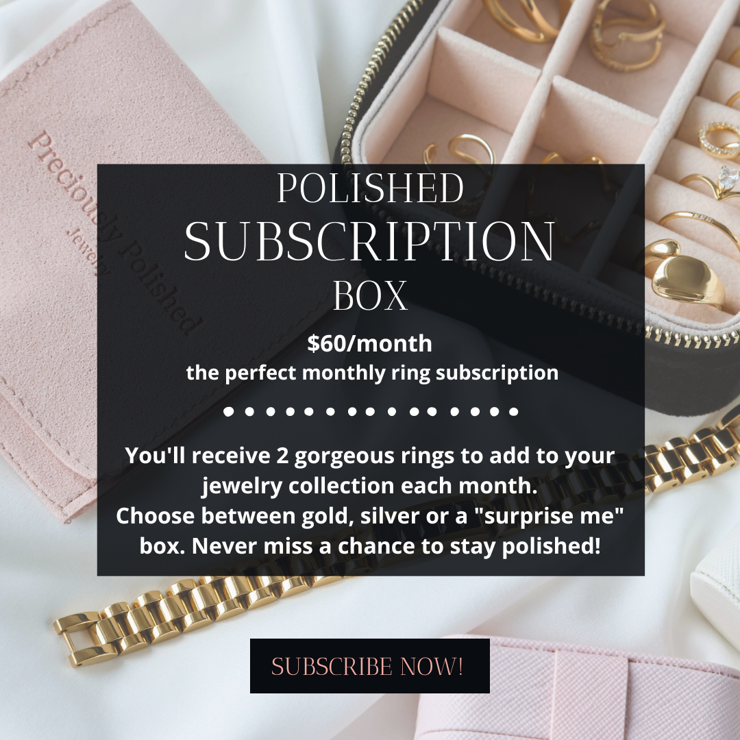 Treat yourself or a loved one to a monthly surprise with this stylish Polished Subscription Box! You can choose between a silver, gold, or "surprise me" package and receive 2 gorgeous rings per month. Enjoy the thrill of the unknown and add a new stunning piece of Preciously Polished Jewelry to your collection each month with the Polished Subscription Box.