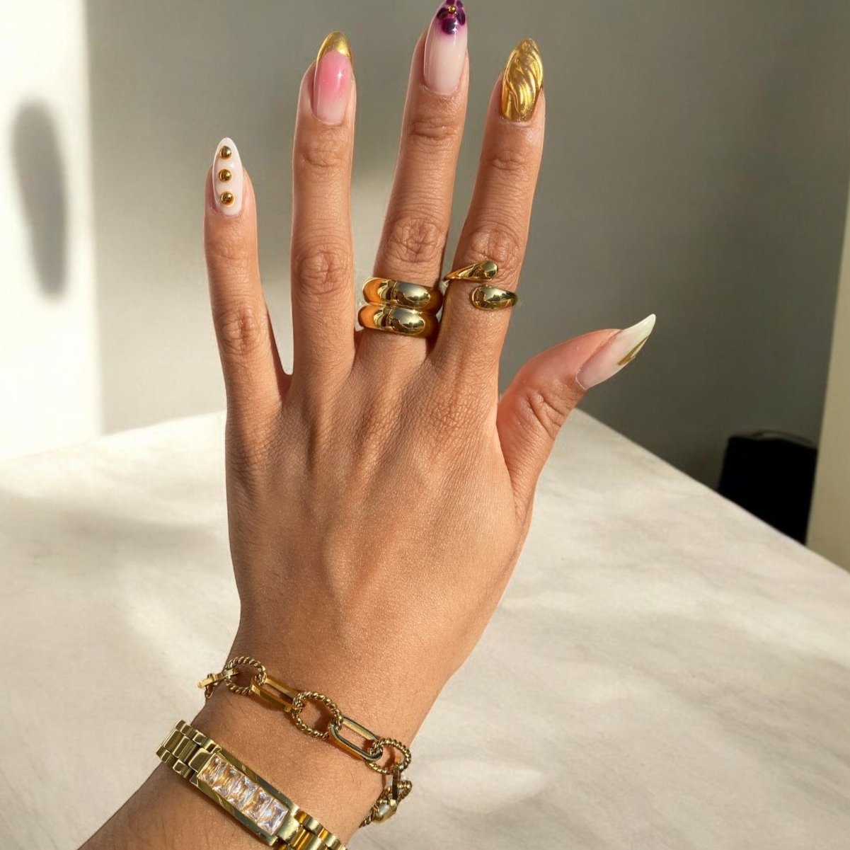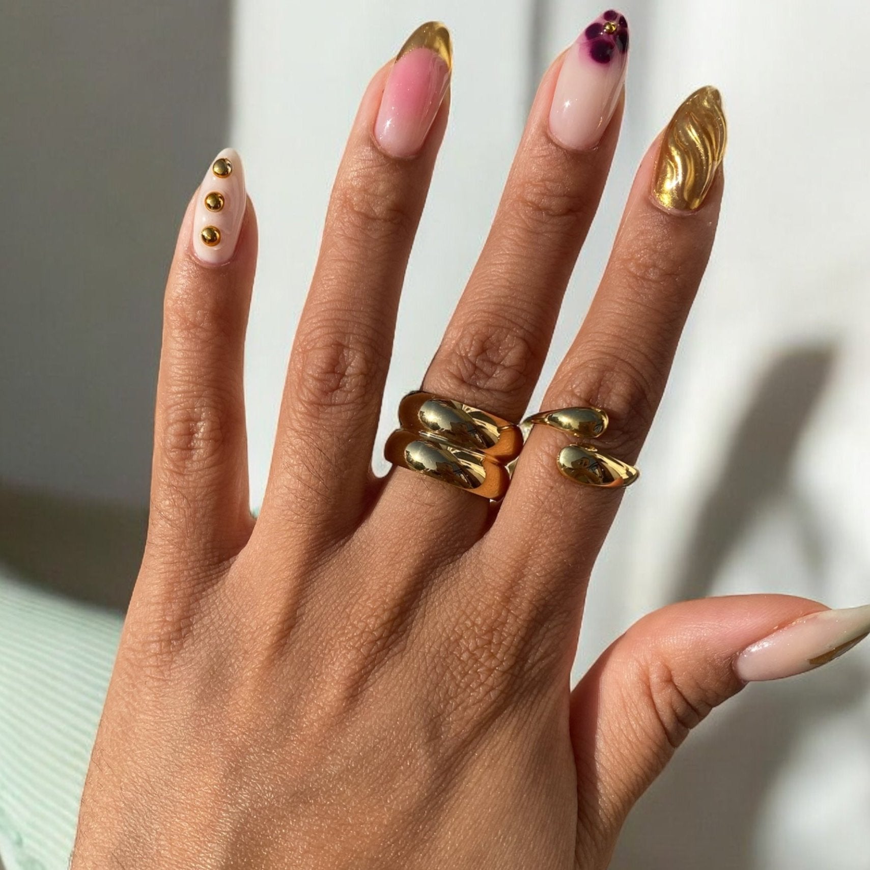 This ring set comes with 1 Chunky Double layer Bubble Ring, and 1 Mirror Images Dome Teardrop Ring. All styles in the set are gold.