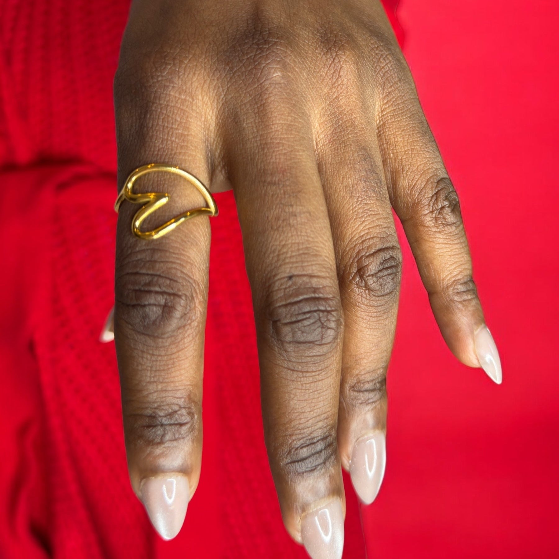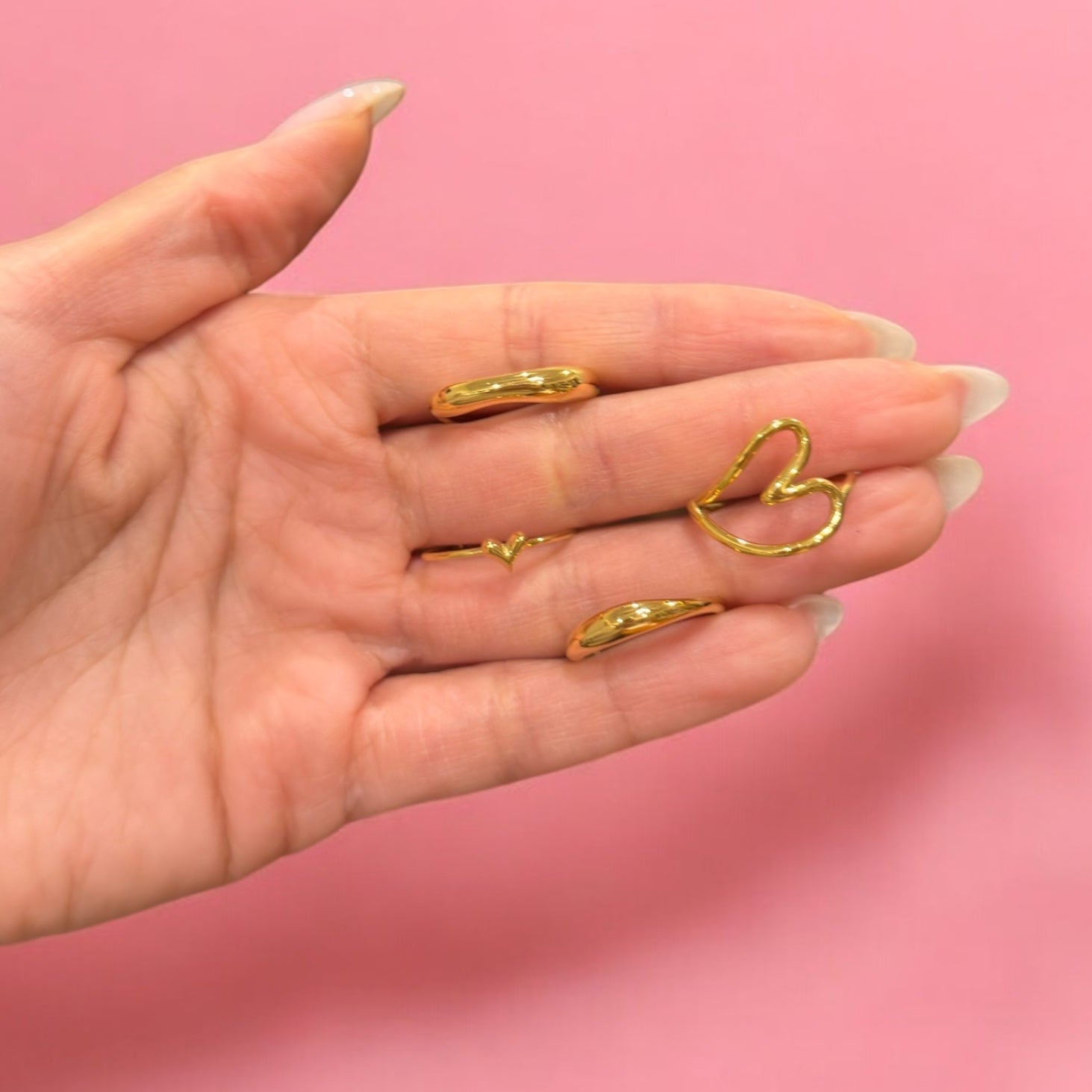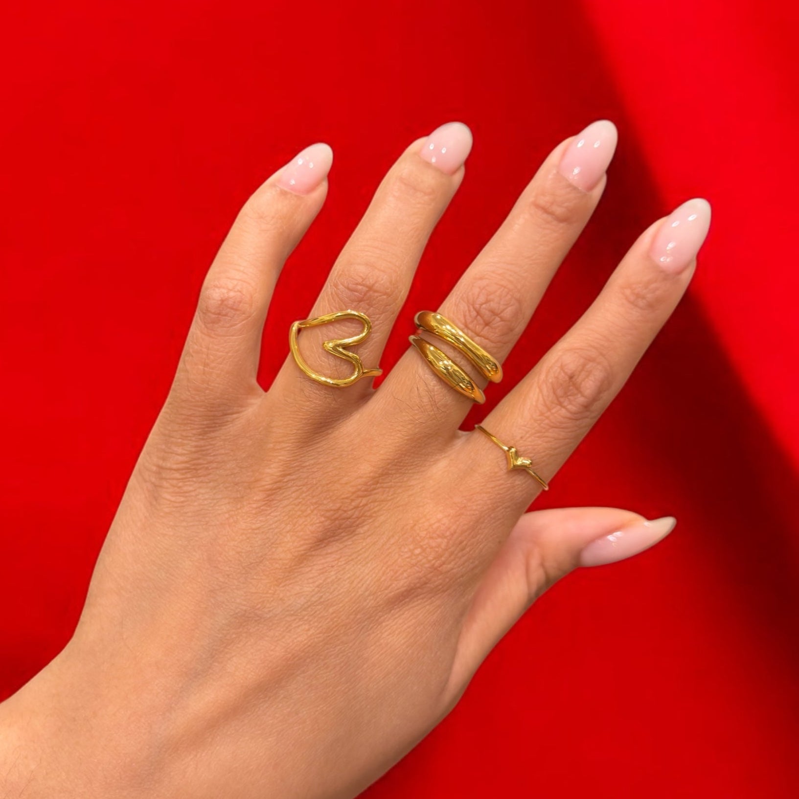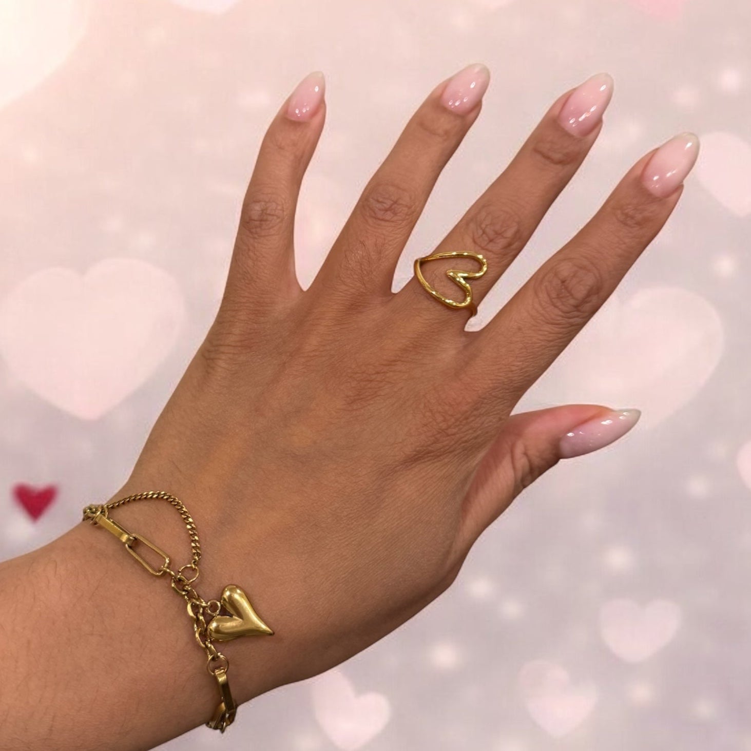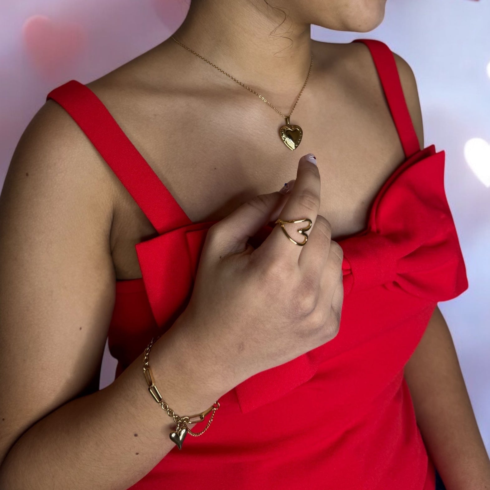 Photographed with the Minimalist Heart Ring, The Heart Charm Chain Bracelet, the heart Locket Necklace, and the Abstract Ring Set. Styles sold individually.