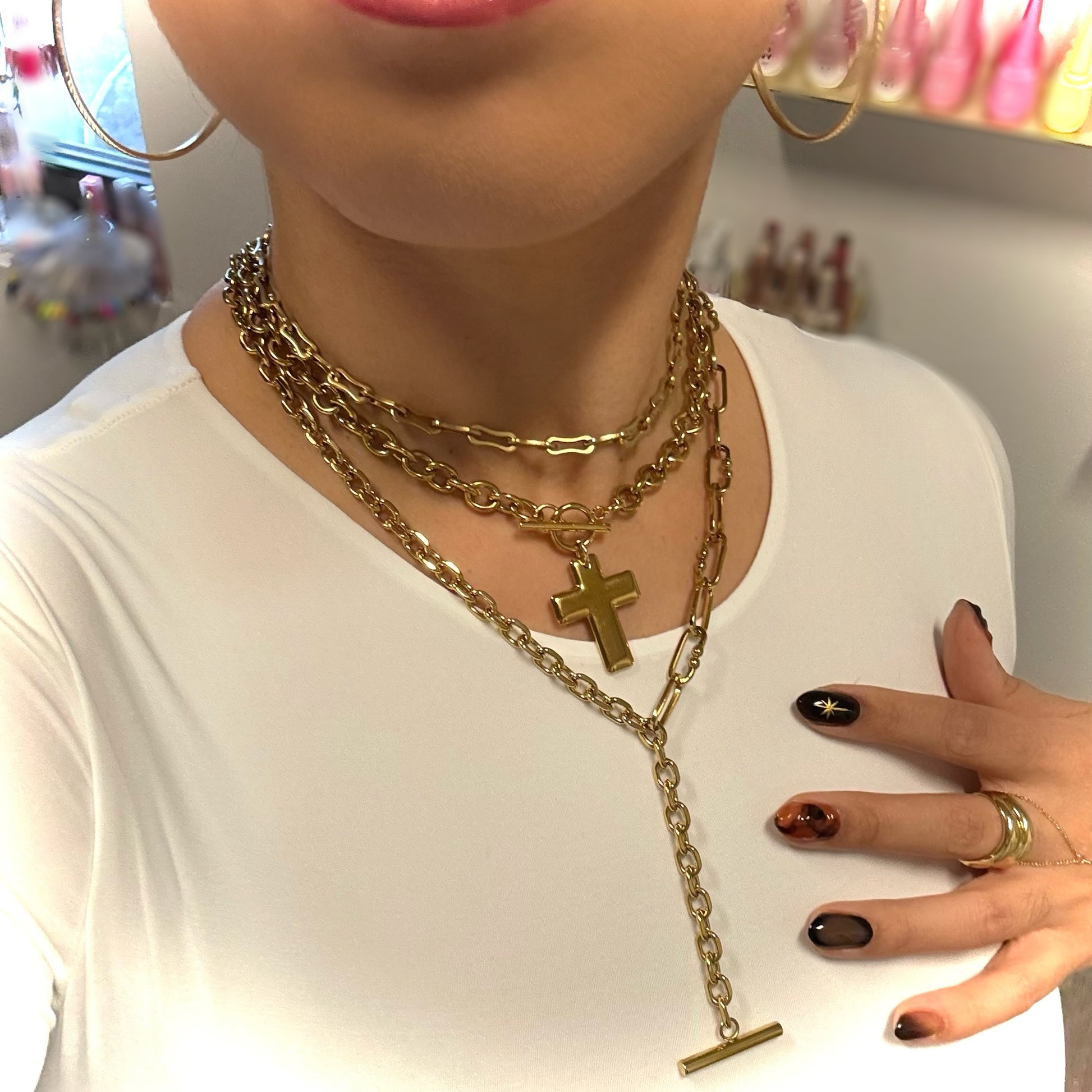 Meet the set that brings confidence, intention, and effortless style into one layered look. The Cross My Heart Necklace Set pairs the Bold Cross OT Clasp Necklace with the Mixed Links Y Drop Necklace to create a striking combo that feels modern, powerful, and personal.