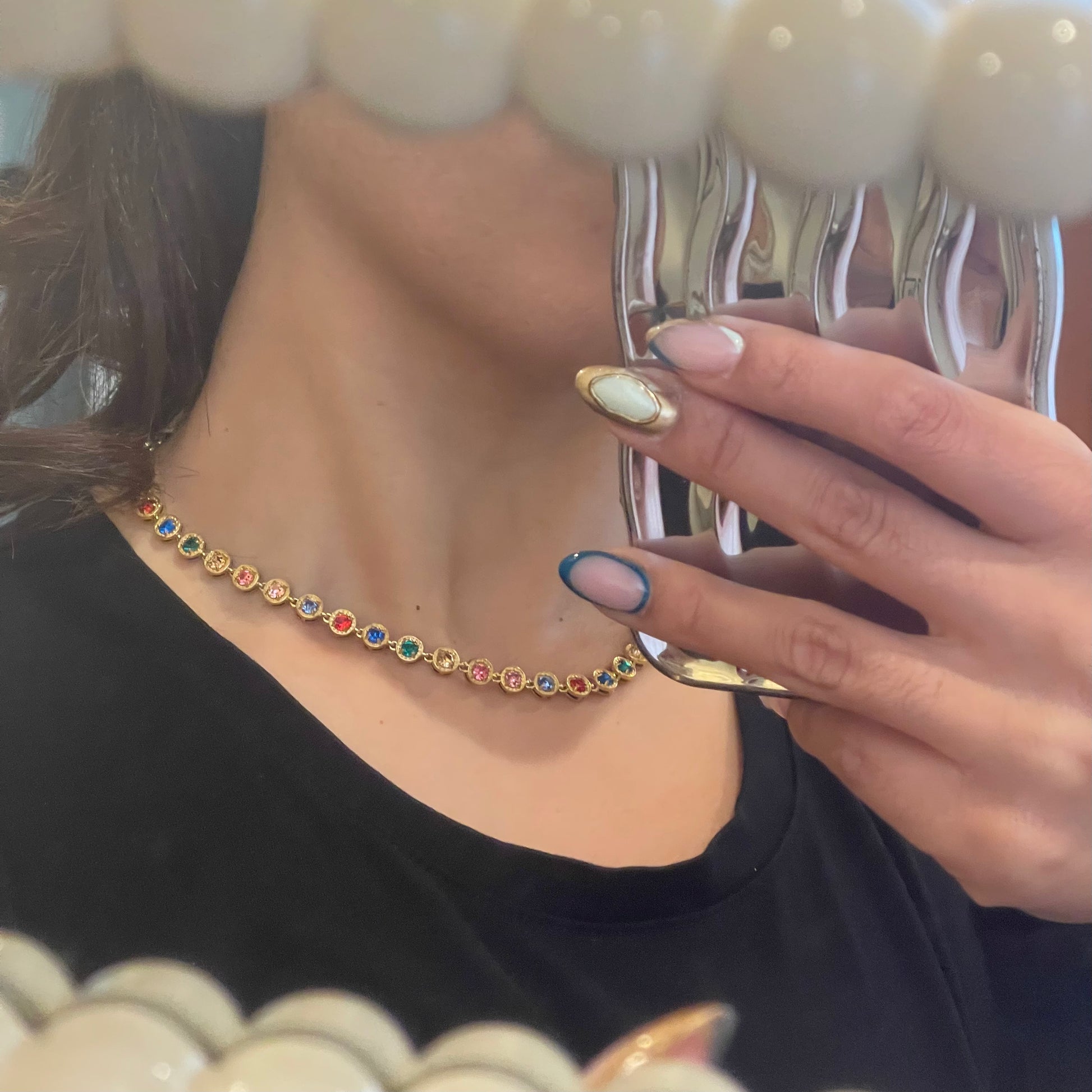 Whether you're stepping into a meeting, heading to brunch with your girls, or just catching your reflection mid-scroll, this necklace adds that effortless “I’ve got it together” glow. Each delicately-set gemstone brings a subtle pop of color, helping you feel more alive, more vibrant, more you.