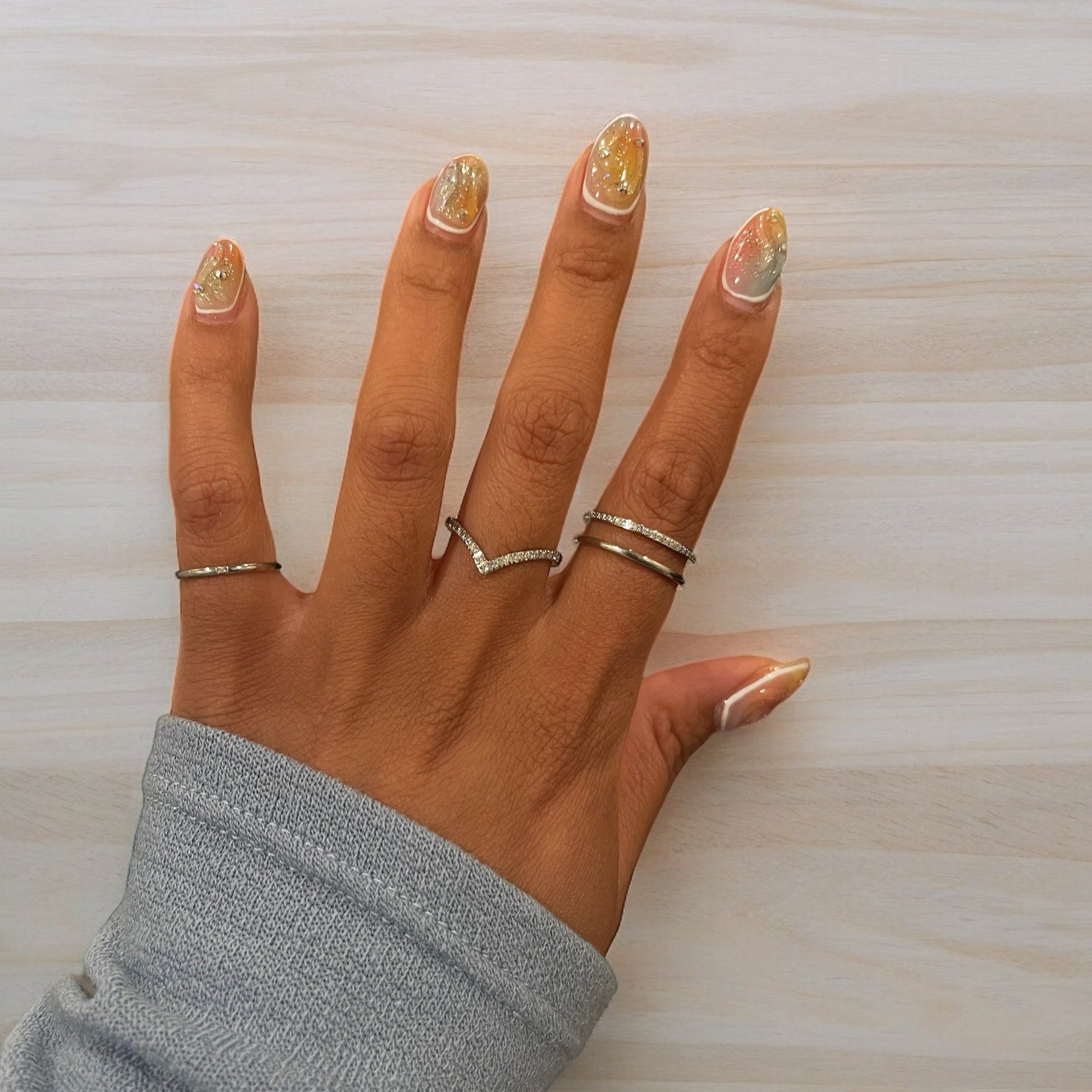 This ring set comes with 1 Dainty V Band Ring - Silver, 1 Double Layer Ring - Silver, and 1 Dainty Stone Stacking Band Ring - Silver.
